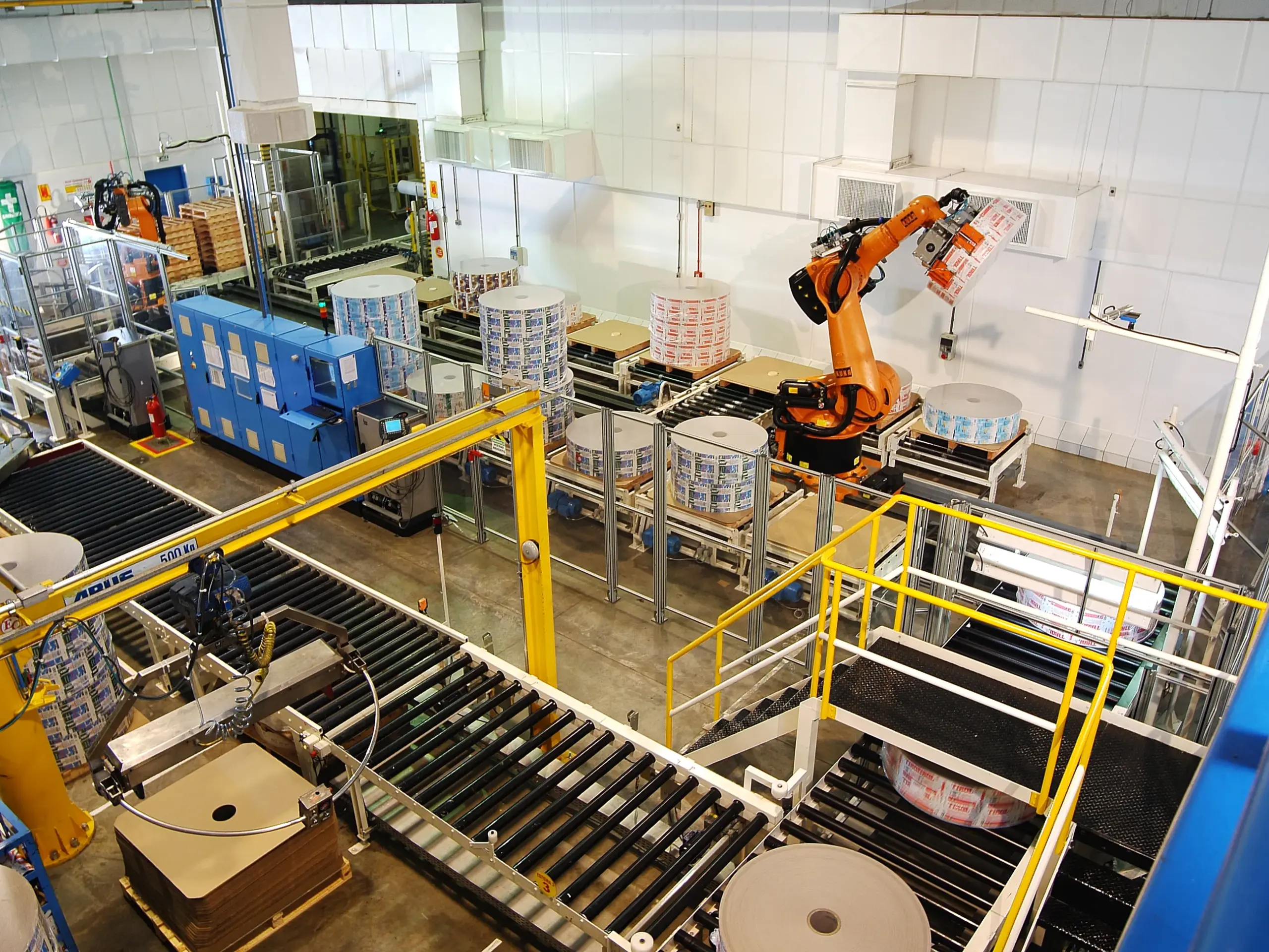 Célula de classificação por imagem e empilhamento de bobinas de papelão para embalagens. Robô de alto pay-load montado sobre sétimo eixo.