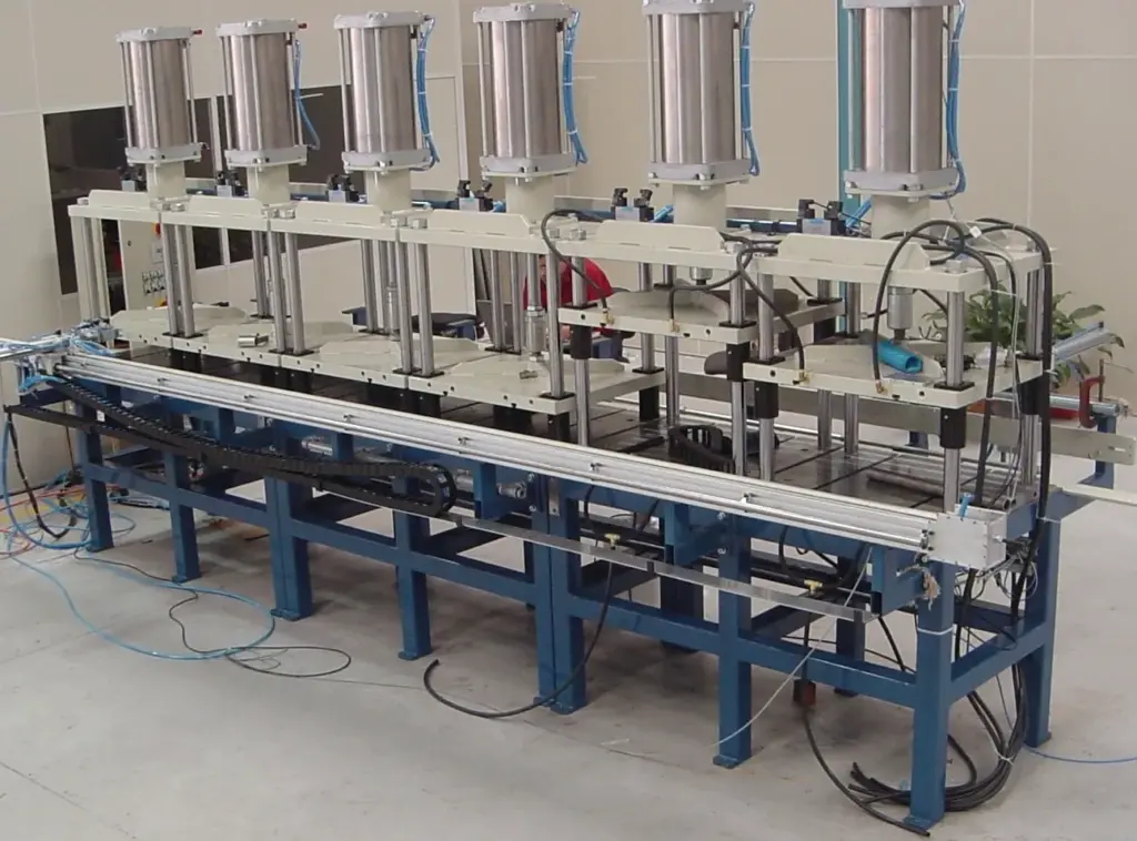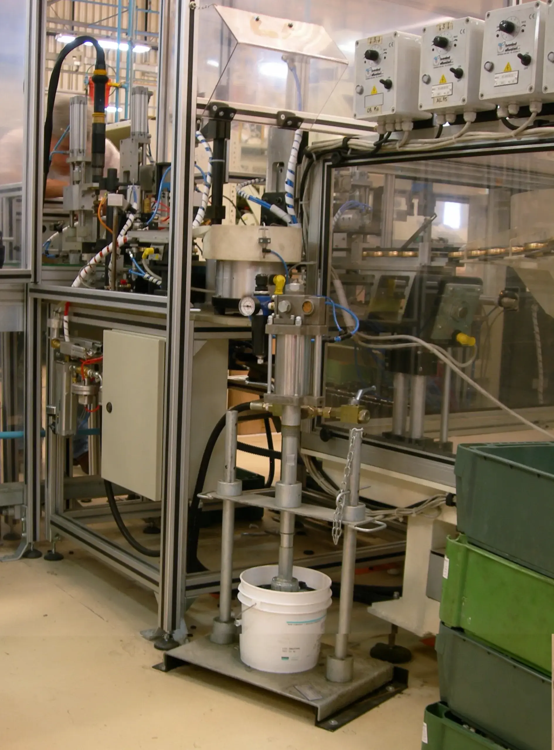 Célula automática de montagem em linha de válvulas hidráulias, com seus diversos componentes; bases, hastes, tampas e vedantes.
