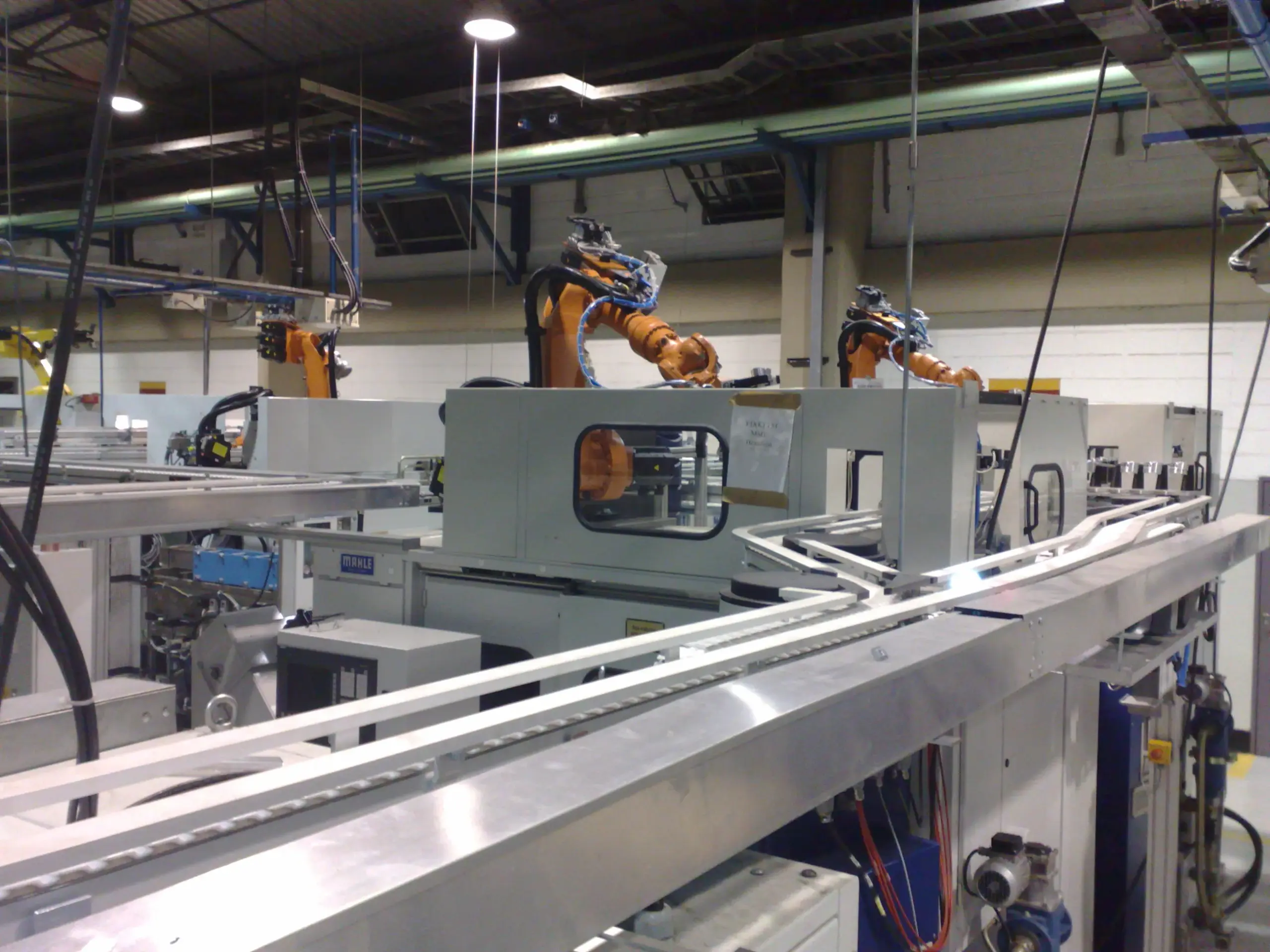 Linha de alimentação automática aérea de peças bercadas para centros de usinagem em sequência, com elevadores de entrada e saída, posicionadores e transfers, poka-yokes e garras robóticas.